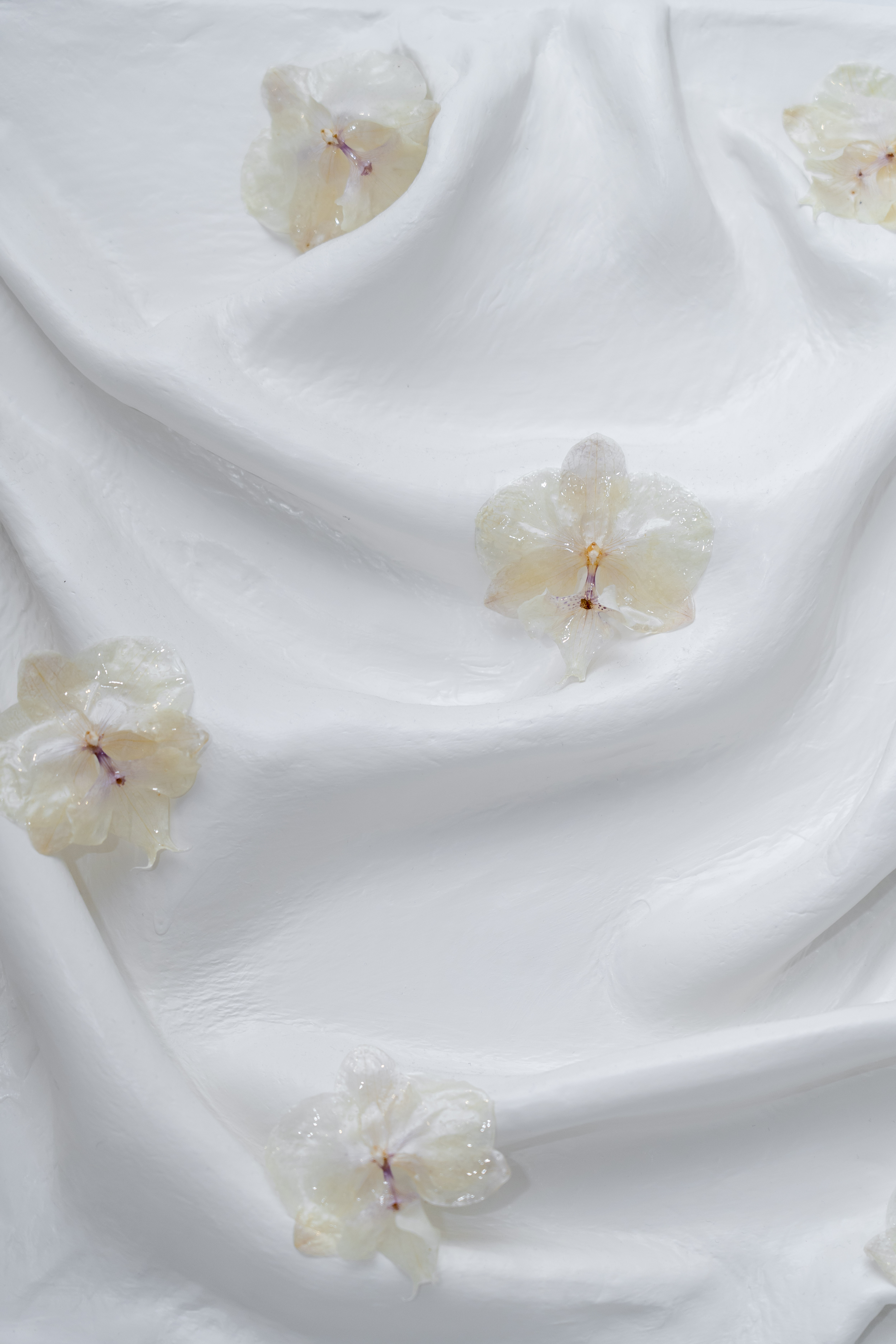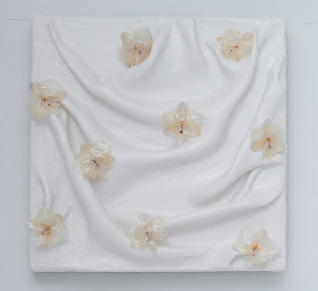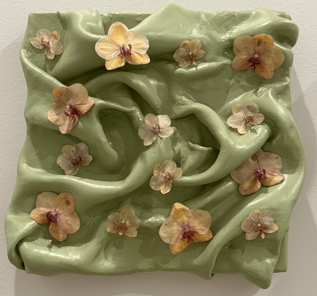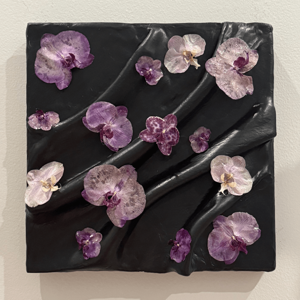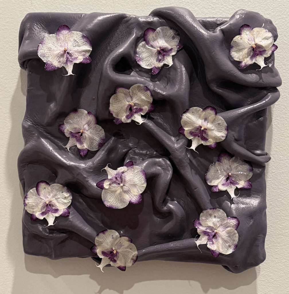 Improvement as Imperfection – 14×14″ Clay Sculpted on Canvas with Preserved Orchids (AVAILABLE)