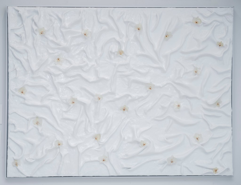 Clouds – 14×14″ Clay Sculpted on Canvas with Preserved Orchids (SOLD)